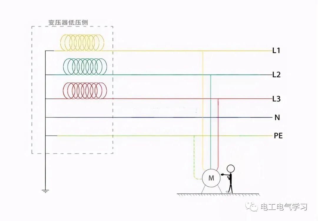 图中的TN-S供电系统,我们可知变压器低压侧的零线是已经进行接地了的。要是以大地为一个参照物,则零线与大地的电位从头到尾都是零。